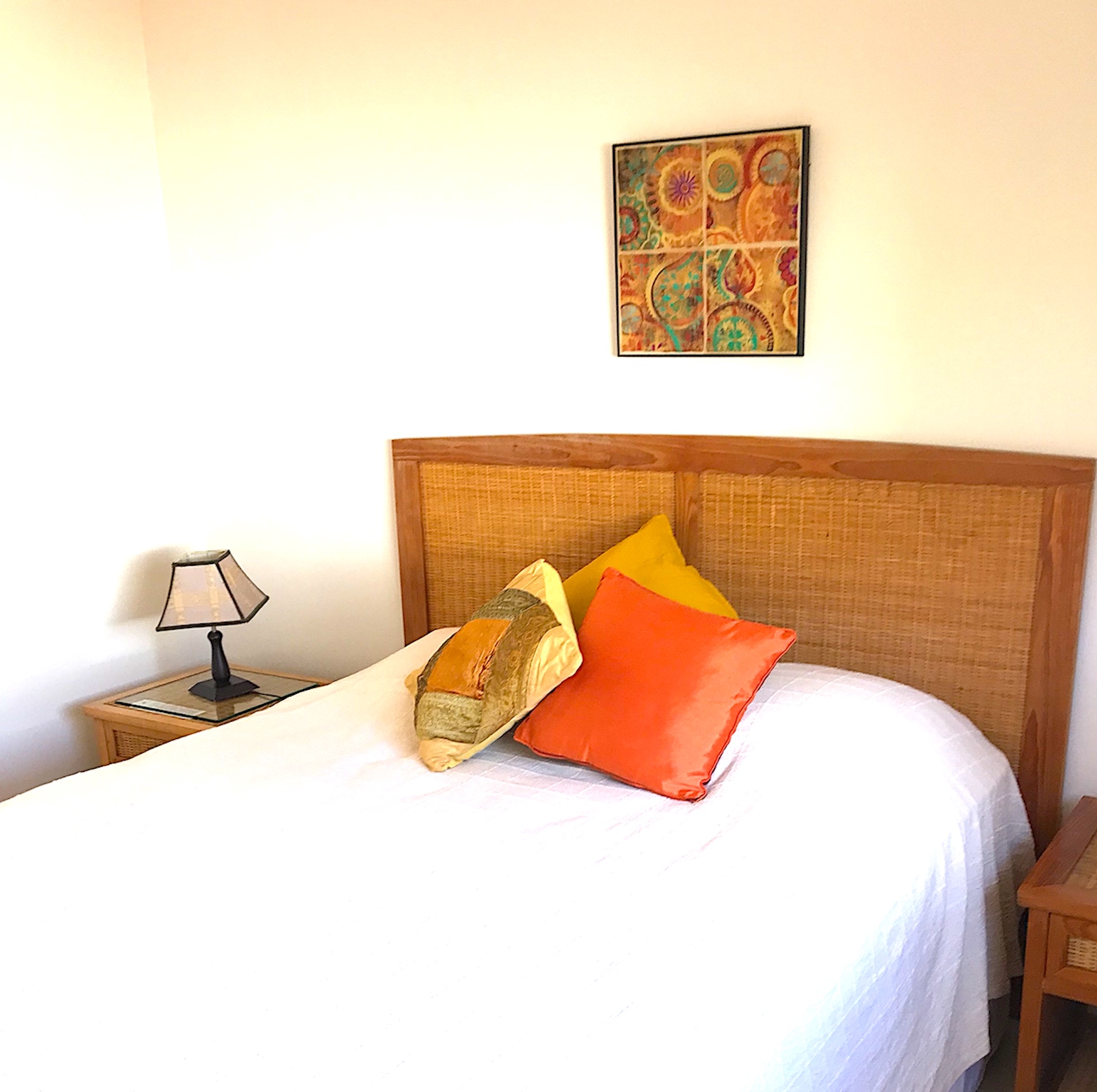 Roof Top Ocean View From here you can see the sea, the pool, and the open terrace surrounded by trees. The living decor is rattan with rust pattern colours and bamboo blinds on large windows overlooking the terrace and the ocean. The bedroom is white with red accents and very cozy. This en-suite room with queen size bed has ample cupboard space and drawers for your clothes and possessions.